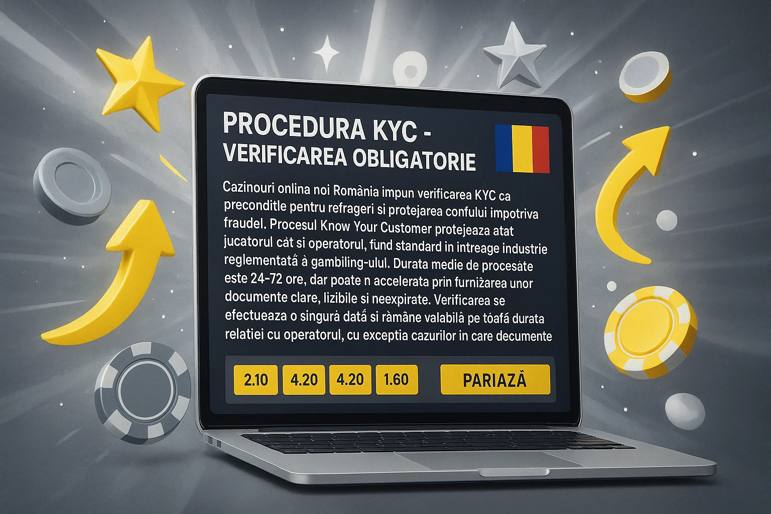 Cazinouri online noi romania impun verificarea KYC ca preconditie pentru retrageri si protejarea contului impotriva fraudei. Procesul Know Your Customer protejeaza atat jucatorul cat si operatorul, fiind standard in intreaga industrie reglementata a gambling-ului. Durata medie de procesare este 24-72 ore, dar poate fi accelerata prin furnizarea unor documente clare, lizibile si neexpirate. Verificarea se efectueaza o singura data si ramane valida pe toata durata relatiei cu operatorul, cu exceptia cazurilor in care documentele expira.